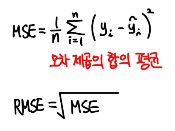 RMSE(Root Mean Squared Error)는 오차를 제곱했기 때문에 MSE에 루트를 씌워준 것이다.