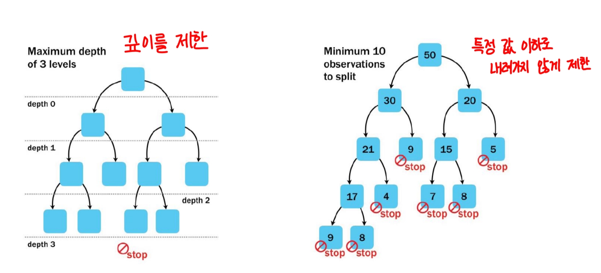 - 과도하게 성장한 의사 결정 트리는 훈련 데이터셋에서만 관찰되는 너무 구체적인 오류를 포착할 수 있으며,