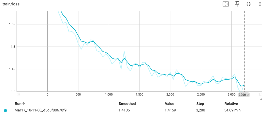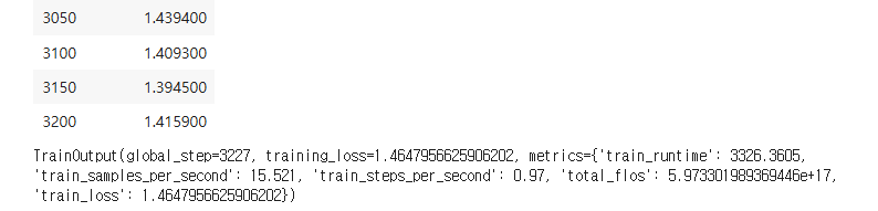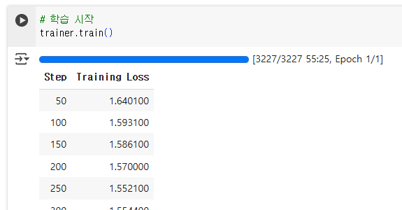 그래프 분석: 손실 곡선(train/loss)은 0 스텝에서 약 1.6 이상으로 시작해 3227스텝(1epoch 완료)에서 약 1.41 으로 수렴했습니다. 초기에는 급격히 감소하다가 중반 이후에는 완만한 감소 추세를 보이며 안정화되었습니다.