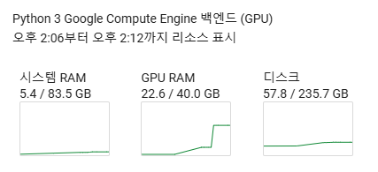 => 학습시간이 약 21시간이 걸리고, GPU가 버티질 못해 Colab에서 자원을 할당받기로 결정했다.