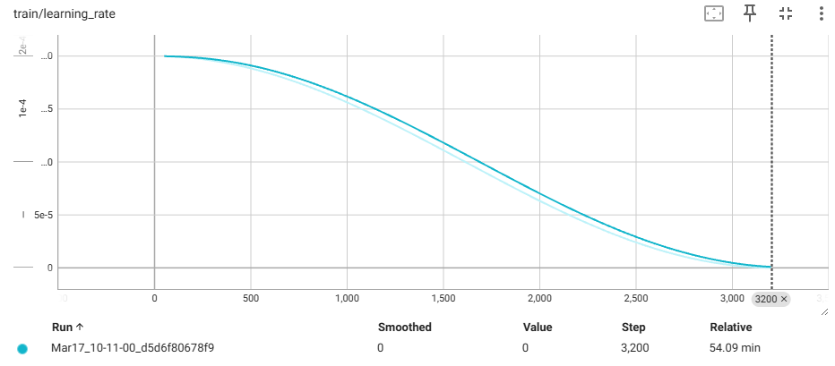 그래프 분석: 학습률(train/learning_rate)은 0 스텝에서 약 2e-4(0.0002)로 시작해 3227 스텝에서 0으로 수렴했습니다. cosine 스케줄러에 따라 부드럽게 감소하는 곡선을 그리며, 중반 이후에는 급격히 줄어드는 경향을 보였습니다.